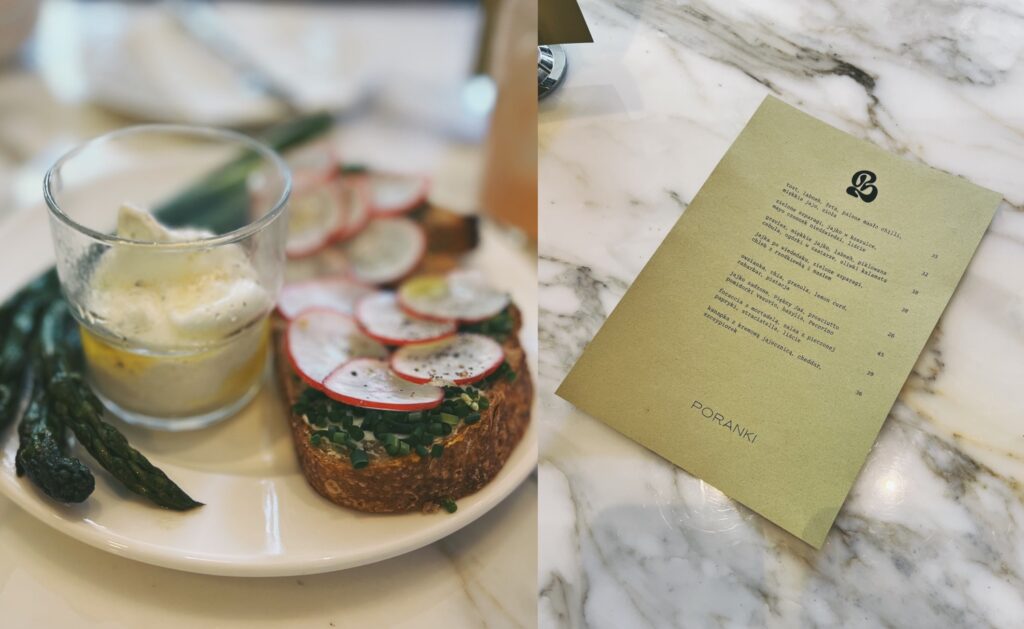 Restauracja nie została jeszcze oficjalnie otwarta, więc menu podlega stałym zmianom. Od 9 do 16 skosztujemy propozycji śniadaniowych, a po 17 przestrzeń staje się barem. My zdecydowaliśmy się na wizytę w odsłonie porannej. W karcie królują jajka w rozmaitych odsłonach (w koszulce, po wiedeńsku, na miękko, sadzone i w postaci jajecznicy). Wielbicie słodkich śniadań powinni skosztować owsianki z rabarbarem i pistacją. Miłośnicy szparagów i delikatnego labnehu też nie wyjdą z Barbary rozczarowani. Do picia kawa (także przelewowa) i herbata oraz sezonowy kompot, lemoniada, kombucha czy sok od rolnika. Ceny wahają się od 26 do 45 zł za jedzenie i od 8 do 22 zł za napoje