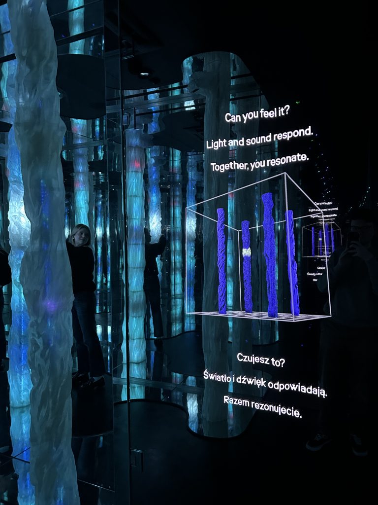 Wykrycie jednej dłoni wyzwala także dźwięk syntezatora. Z pomocą drugiej ręki tak powstałe brzmienia można filtrować, pogłębiać i przestrajać, trochę jak w przypadku thereminu – tajemniczego instrumentu, na którym gra nie wymaga bezpośredniego dotyku. Niepostrzeżenie stajemy się dyrygentami leśnej, futurystycznej orkiestry. Wejście w tę rolę jest o tyle ekscytujące, że za warstwę audialną instytucji przygotował doświadczony kompozytor i producent, Szatt. Artysta dobrze wie, jak roztaczać immersyjne, elektroniczne tła.