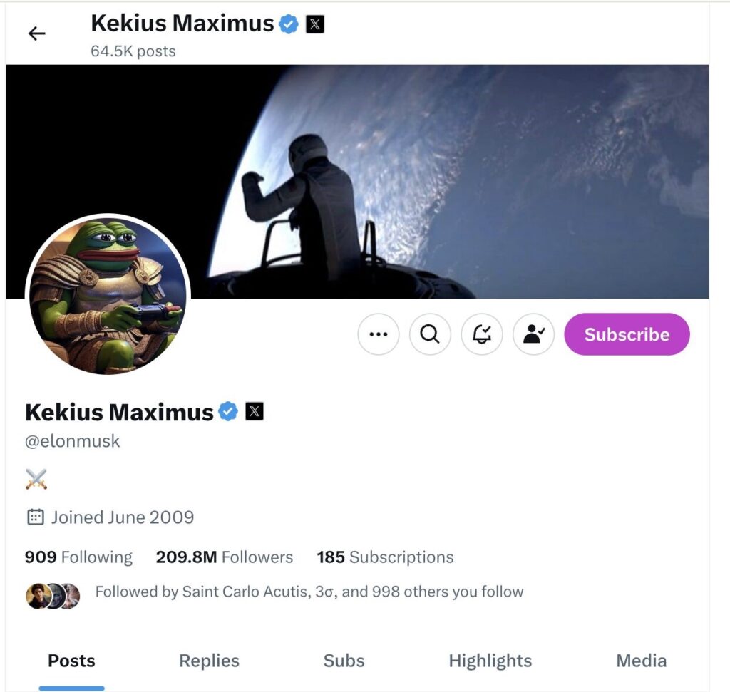 Kilka dni później Pepe bez większego komentarza zniknął z profilu miliardera, a ten płynnie przeszedł do planów podboju świata, atakowania adwersarzy i dzielenia się życiowymi mądrościami na każdy temat. W maju wrócił jeszcze do przydomku Kekiusa, tyle że dał już spokój żabie i sam zapozował ze zbroją. Potęgę miał mu jeszcze nadać samozwańczy tytuł cesarza.