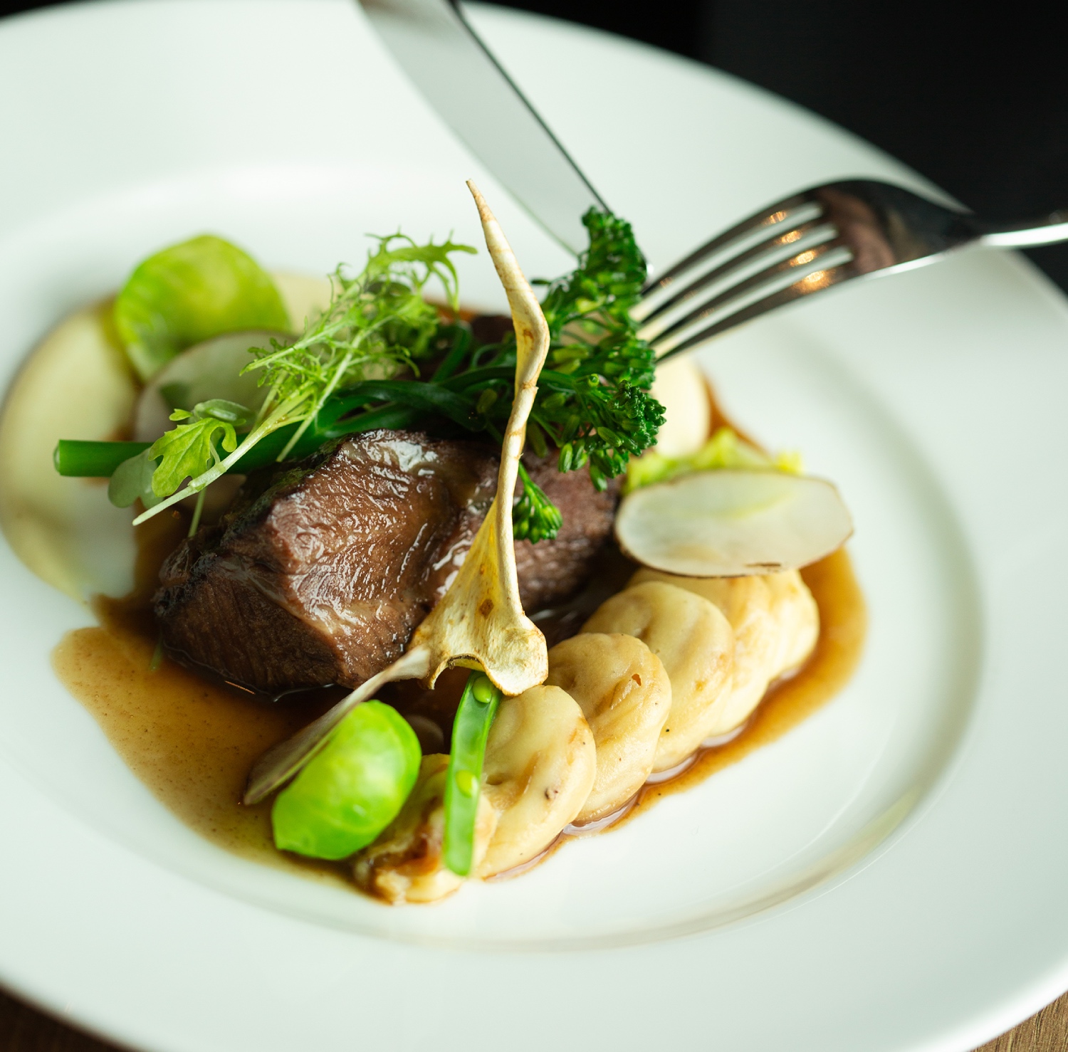 Na festiwalowej mapie znalazły się również Warmia i Mazury. Położony nad Jeziorem Mikołajskim Nóż w Wodzie łączy eleganckie wnętrza i nuty lokalnej kuchni. W menu pojawiają się muffinka ziemniaczana z boczkiem i kremem buraczanym czy żeberka wieprzowe z puree na bazie zsiadłego mleka. Wersja roślinna zachwyci zaś kremem z marchewki z imbirem oraz tagliatelle z pesto z jarmużu, kozim serem i pestkami dyni.